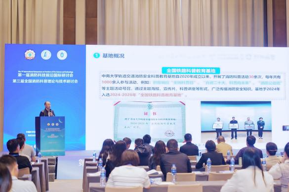 科普基地并非孤立的项目,而是依托中南大学土木工程学院雄厚的科研平台与消防工程系的专业力量,已建设成为一个集教学实训、公众科普、技术展示和应急演练于一体的综合性平台。中南大学消防工程系主任范传刚教授向与会代表人员系统介绍了基地荣获的“全国科普教育基地”、“2024-2028年全国铁道科普教育基地”、“2025-2029年全国公路科普教育基地”以及中国科协“高校星火馆”等一系列国家级荣誉,并强调这集中体现了中南大学消防工程系在服务国家安全战略、履行社会责任方面的担当与作为。