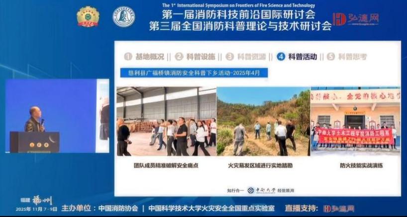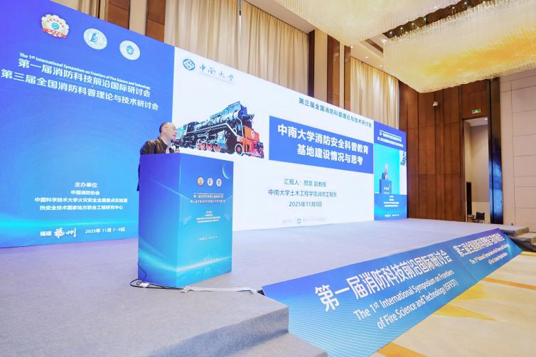 11月8日,我院消防工程系范传刚教授和颜龙副教授在福州参加第三届全国消防科普理论与技术研讨会和第一届消防科技前沿国际研讨会。本届会议的线下参会人数达500余人,各平台直播总量高达272万,创历史新高。颜龙副教授在会上作了《中南大学消防安全科普教育基地建设情况与思考》专题报告,引发了与会专家学者的广泛关注与热烈反响。这不仅是一次高水平的科普交流,更是对“大学何为”这一时代命题的深刻回应——如何将高校的知识优势转化为守护公众安全的社会力量,“中南方案”给出了响亮的回答。