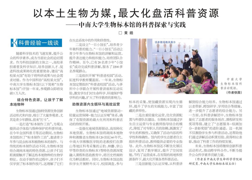 随着科学技术的飞速发展,提升公众的科学素养,成为当前社会的迫切需求。作为科技创新的主体之一,高校承担着普及科学知识、培养创新人才、促进科技成果转化的重要使命,建设“高校星火馆”有助于将科研成果与社会需求对接。作为中国科协“高校星火馆”,中南大学生物标本馆(以下简称“生物标本馆”)开馆一年来,参观群众即将突破1万人次。
